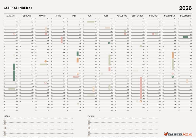 Ontdek onze jaarkalender 2026 met een grote verscheidenheid aan functies en ontwerpen. Elk model toont alle 365 dagen en 53 weken, van donderdag 1 januari tot donderdag 31 december 2026. Alle kalenders zijn gebaseerd op de Gregoriaanse kalender.